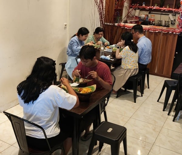 Makan siang santai bersama rekan kantor.